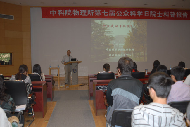 物理所解思深院士为大家做了“什么是纳米科技?”的科普报告,内容丰富多彩、语言通俗易懂,从纳米的基本概念介绍到纳米科技在生活方方面面中的应用,报告吸引了众多听众,有在读的研究生,也有小学生和社会公众,整个报告厅座无虚席。