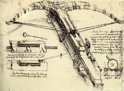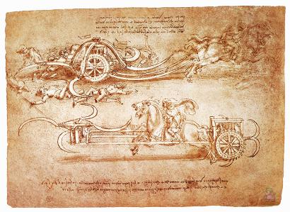 军事发明家达芬奇。达芬奇还发明了许多军事武器,如簧轮枪、子母弹、三管大炮、坦克车、浮动雪鞋、潜水服及潜水艇、双层船壳战舰、旋转浮桥,甚至还有滑翔机和直升机等等(这可要比莱特兄弟早多了,要是他们兄弟俩早点看到这图纸估计就不会费那什么劲了)。这些武器大都创意独到,而且设计精巧。如下面的图,这种带刀的战车估计只能在现在的幻想游戏里见到,何等之美!