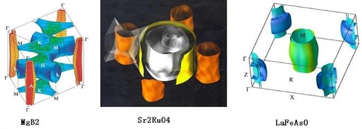 我们可以看到,这些超导体里面费米面有两个甚至是多个。MgB2的费米面里面是一堆“塑料薄膜”连接在一起,四周是四个独立的小圆片(实际上是八个,里面还分别套着一个)。Sr2RuO4则像一圈卫生纸,一圈圈的没完似的。而LaFeAsO这个今年才发现的超导体,费米面也是有多重多样。对于这些有多个“脸蛋”的超导体,它们的特性是非常丰富的,因为不同的“脸面”之间还存在复杂的相互作用。研究它们的费米面以及费米面所决定的性质,可以为它们的各种应用打下坚实的基础。