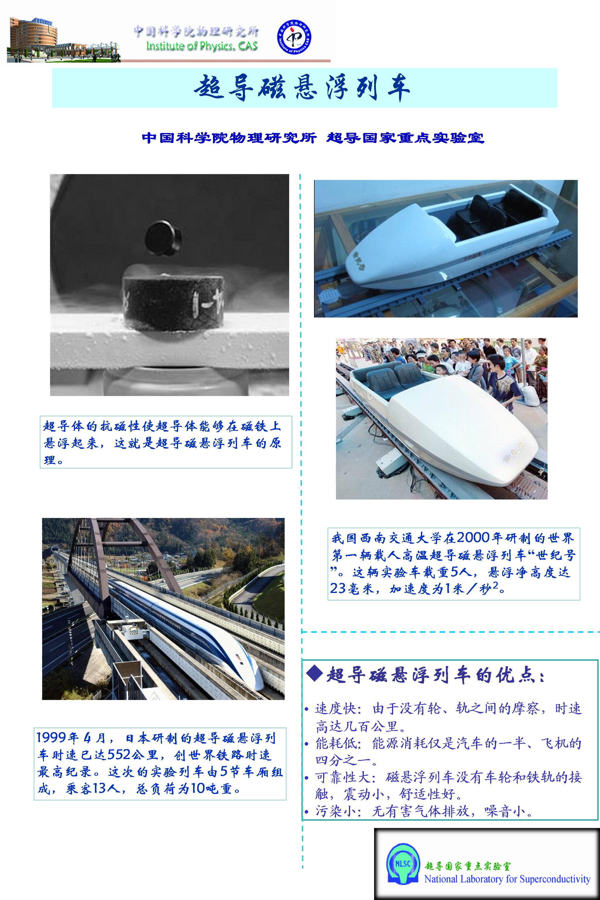 通过利用超导体对永磁体的排斥和吸引的作用,演示、理解和掌握磁悬浮原理,使参观者对磁束缚、旋转磁场、直线电机等有更清晰的感性认识。利用这种磁悬浮效应可以制作高速超导磁悬浮列车。这是一种采用无接触的超导磁悬浮、导向和驱动系统的磁悬浮高速列车系统,其研究和制造涉及自动控制,电力电子技术,直线推进技术,机械设计制造,故障监测与诊断等众多学科,技术十分复杂,是一个国家科技实力和工业水平的重要标志,它与普通轮轨列车相比,具有低噪音,无污染,安全舒适和高速高效的特点,有着"零高度飞行器"的美誉,是一种具有广阔前景的新型交通工具,特别适合城市轨道交通。物理所的超导磁悬浮列车已多次在科学公众日上为中小学生及高校参观代表团进行展示,他们对演示产生非常浓厚的兴趣,激发了他们的科学热情。