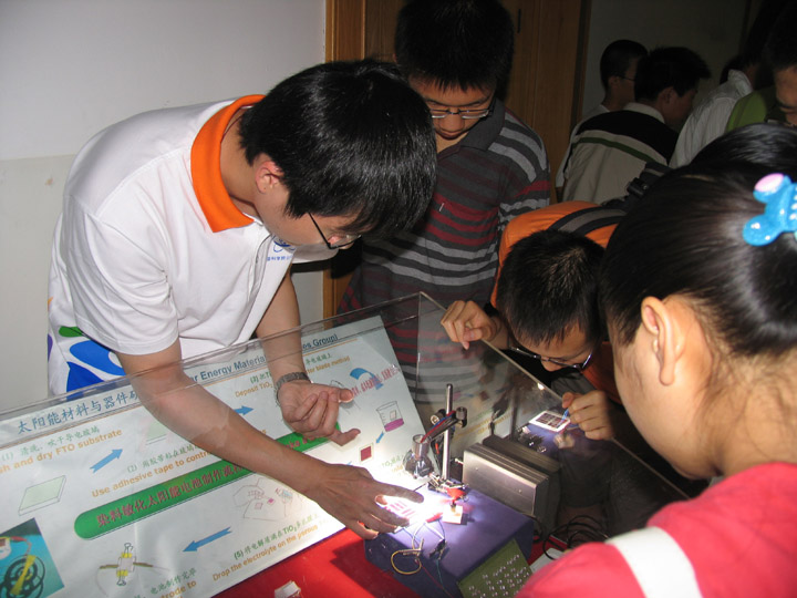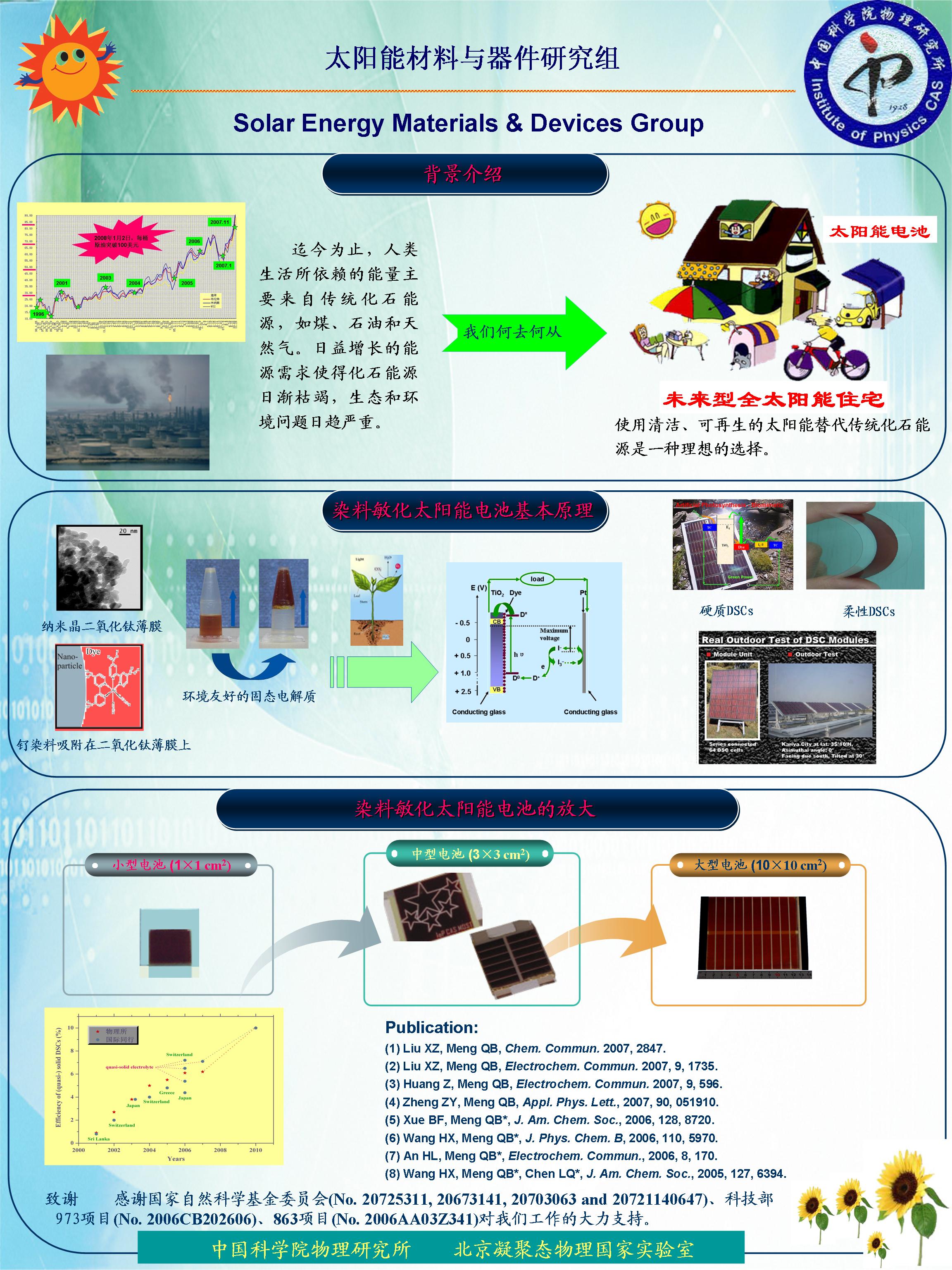 以化石燃料为主的常规能源资源日益枯竭,造成的环境污染也日益严重。开发利用可再生能源已成为世界各国政府持续发展新能源的战略决策。太阳能作为一种清洁的可再生能源,具有其它能源无可比拟的优势。纳晶染料敏化太阳能电池是上世纪九十年代初发展起来的新型光伏器件,具有制备工艺简单、低成本、低价格方面的突出优势,在新一代薄膜太阳能电池中最具有产业化前景的薄膜太阳能电池。物理所在染料敏化太阳能电池的放大和集成方面也作出了非常有特色的工作,处于国内领先地位。目前,公众对染料敏化太阳能电池的了解还极其有限。本演示实验一方面能够直观的展示给公众,使得公众对此类电池有一个表观认识,进而提高公众发展可再生清洁能源利用的认识和紧迫感。