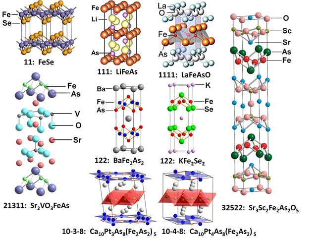 图5:目前已经发现的铁基超导体系的典型母体结构,其中“LiFeAs”、“KFe2Se2”、“Sr2VO3FeAs”、“Sr3Sc2Fe2As2O5”由中科院物理所研究团队发现。