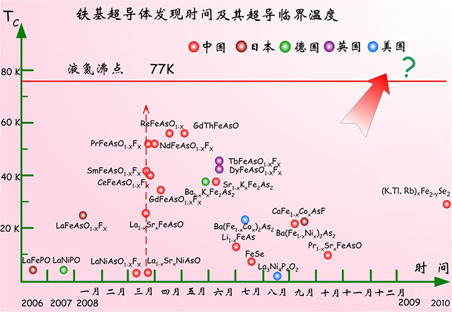 图6:铁基超导体发现时间及其超导临界温度,不同颜色代表发现者所在国家。2008年3月左右,物理所及中国其他同行科学家们通过稀土元素替换,在短时间内将“1111”体系的超导临界温度提高到了55K以上,聚焦了全世界科技人员的目光。