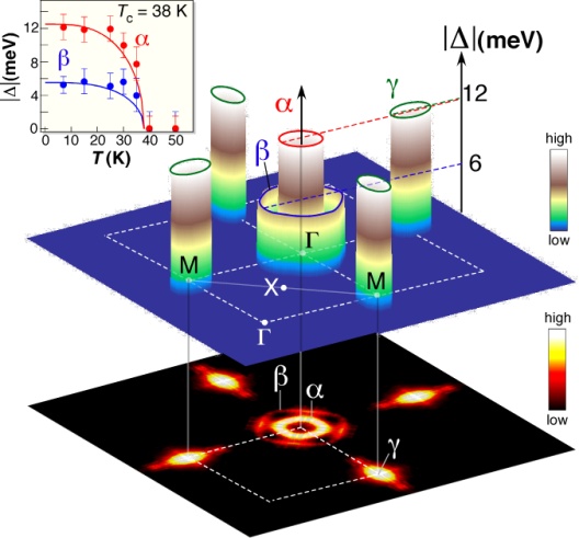 图8:物理所利用高分辨角分辨光电子能谱仪对新发现的超导体进行了研究。观察到该材料具有两个不同值的超导能隙。铁基高温超导体的超导电子对对称性的成功确定对于物质电子结构的理解带来很大进步。该项工作以发表在2008年出版的Europhys. Lett杂志上。美国阿贡国家实验室的Michael Norman为美国物理学会2008年创刊的Physics杂志中“trends”栏目撰写了关于铁基超导体物理研究的短评文章,重点介绍了此项工作。同时 EuroPhysics News以 Pairing symmetry of iron-based superconductors为题目选作研究亮点进行报道。2008年8月1号日本《科学新闻》以“铁系高温超导体的超导电子对对称性的成功确定对于物质结构的解析带来很大进步 ”为标题对这项工作进行了报道。