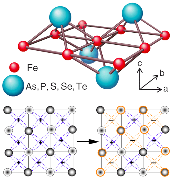 图 10:物理所理论研究人员从晶体对称性出发,建立了一个简洁的铁基超导微观理论,统一解释了不同铁基超导材料能带结构的巨大差异,并同时建立了铁基和铜基超导体的联系。这个研究为统一理解铁基和铜基超导体提供了一个强有力的工具,它使研究铁基超导体电子成对相互作用对称性的问题成为了在铜基超导体中已经被深入、全面研究过的问题。该成果发表在2012年出版的Phys. Rev. X杂志上,并被APS(美国物理协会)选出在 “Physics: spotlighting exceptional research” 作为焦点成果报道。(上图) 铁基超导体的铁砷或铁硒层的基本结构。(下图) 铁基超导体的s-波配对和d-波配对的等价性。
