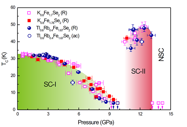 图12:物理所科技人员通过研究高压下新型铁硒基超导体,发现该体系所有的样品在压力下均具有两个超导相存在区。在压力为12.5 GPa时,TC=48.7 K,这是目前新型铁硒基超导体的最高转变温度。相关成果于2012年发表在国际著名科学杂志《自然》Nature杂志上。
