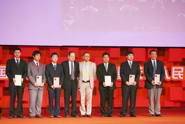 图16:物理所5位科研人员与中国科技大学、人民大学3位科研人员因在铁基超导研究领域的杰出贡献荣获香港求是科技基金会2009年度“求是杰出科技成就集体奖”,杨振宁为获奖者们颁发证书.