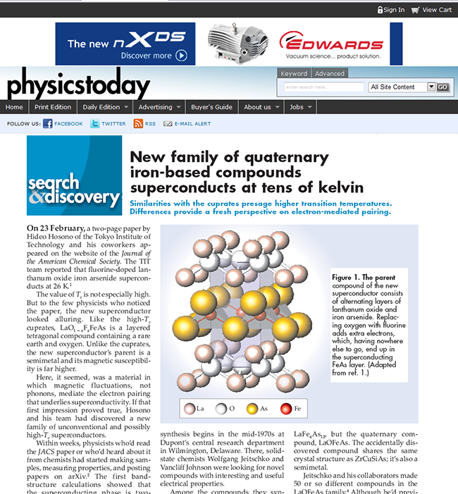 中国科学院网站《<今日物理>追踪高温超导体研究在中国 》