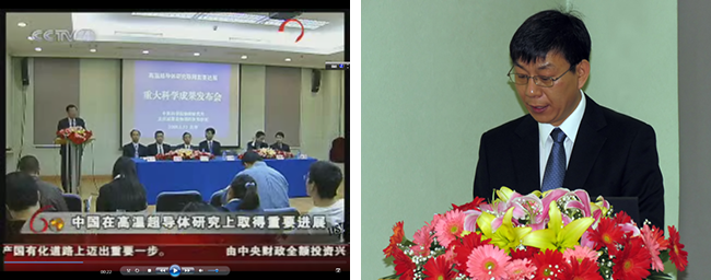 图4:CCTV对新闻发布会进行报道,左图为在物理所D楼210会议室的现场发布会,右图为中科院物理所王玉鹏所长发布新闻