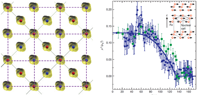 图7:左:从比热、磁电阻、光电导谱测量和第一性原理计算物理所科研人员首次提出LaFeAsO母体具有自旋密度波不稳定性,指出超导和自旋密度波不稳定性相互竞争,并预言了自旋密度波状态下的条纹反铁磁序磁结构,相关成果发表在在Europhys. Lett.杂志上。右:之后与美国科研小组合作进行中子衍射实验,证实了母体的反铁磁自旋密度波基态和理论预言的基态磁结构,发表在Nature 杂志上。