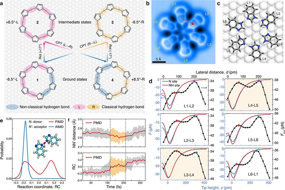 研究还进一步发现,在同一六元环状氢键结构中,通过诱导六个质子的协同迁移,可以实现基态质子序的手性反转(图a)。由于核量子效应的存在,这类手性质子序表现出异常的旋转对称性破缺(图a)。该工作为研究复杂质子序、质子的多体关联以及表面质子输运开辟了全新的实验路径和技术范式。