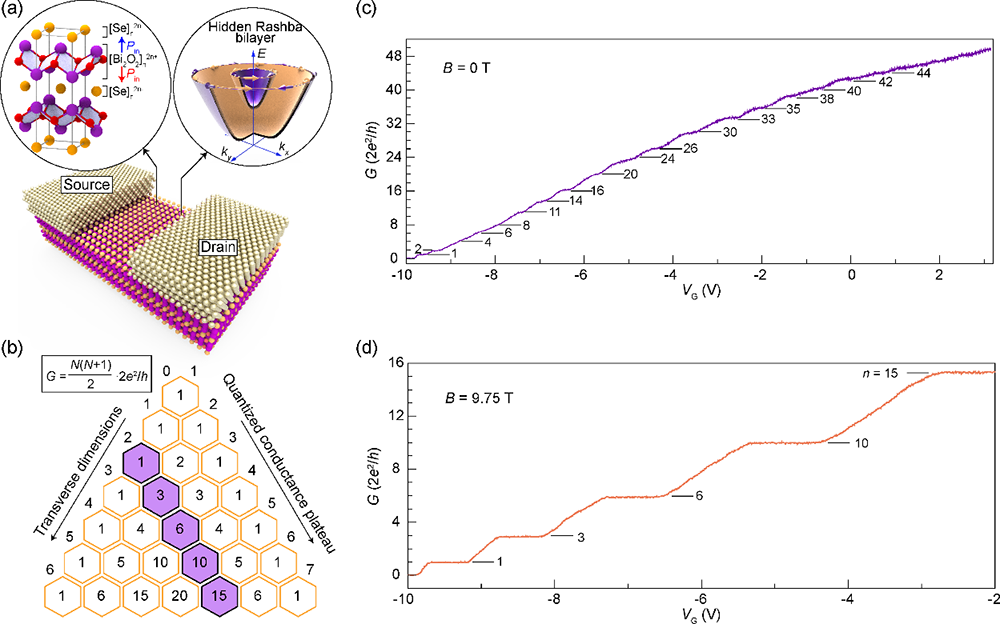 图(a)Bi₂O₂Se中的隐藏Rashba效应。(b)量子化电导帕斯卡三角。(c)零磁场下的电导量子化。(d)磁场下的电导量子化。