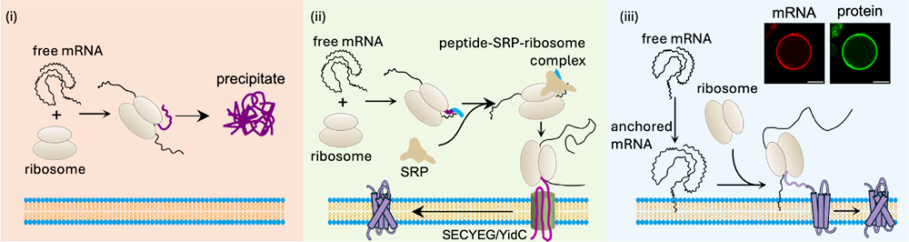 图:膜蛋白合成的三种模式:(i) 在水相溶液中,疏水性膜蛋白在翻译后易发生错误折叠并聚集;(ii) 在细胞内,膜蛋白的翻译与插入通过SRP通路实现共翻译介导;(iii) 本研究提出的mRNA膜近端翻译策略。