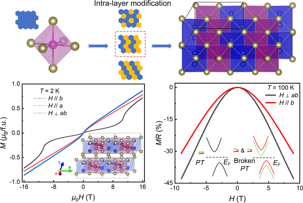 范德瓦尔斯磁性半导体能够同时调控电荷与自旋自由度,对于研究低维磁性以及开发高性能二维自旋电子学器件具有重要意义。其中,以CrGeTe₃、Mn₃Si₂Te₆等为代表的三元过渡金属硫属化物近年来受到广泛关注。此类材料不仅在二维极限下展现出本征磁性,还表现出各向异性正或负大磁电阻、角度依赖庞磁阻等一系列新奇物性。目前已报道的三元过渡金属硫属化物中过渡金属八面体都围绕非金属二聚八面体在层内形成蜂窝结构,但过渡金属八面体和非金属二聚八面体很可能存在其它排布方式,调控这两类八面体的排布有望发现具有新结构类型的三元过渡金属硫属化物。