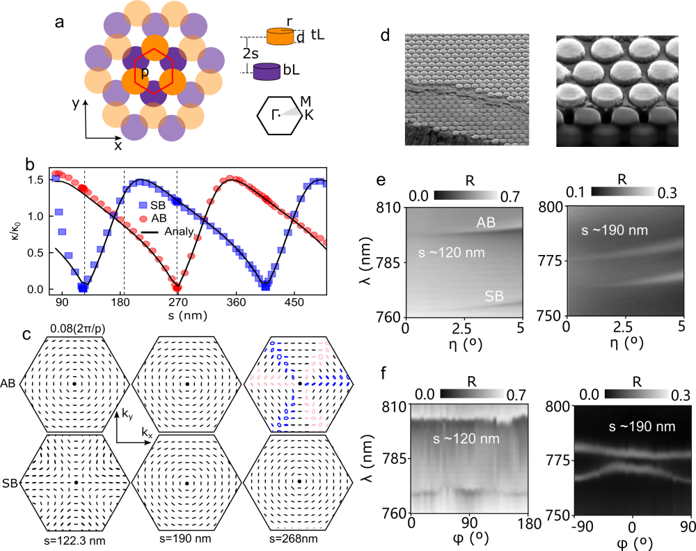 图a 双层氧化钛超表面示意图;b共振态远场辐射相消干涉理论预测;c 不同厚度中间层超表面共振态在动量空间中远场偏振矢量分布;d 套刻工艺加工的双层超表面;e,f 实验测量的角分辨反射光谱