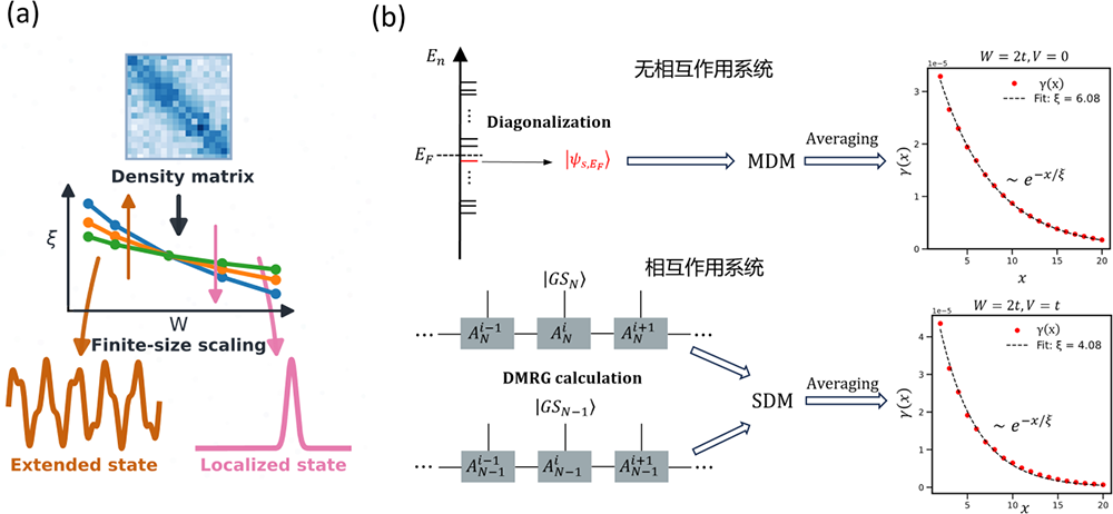 图 1.(a)从密度矩阵中提取系统局域化长度,并通过有限尺寸标度分析判断不同维度中金属-绝缘体相变的示意图;(b)在无相互作用体系/相互作用系统中通过密度矩阵提取局域化长度的计算流程图。
