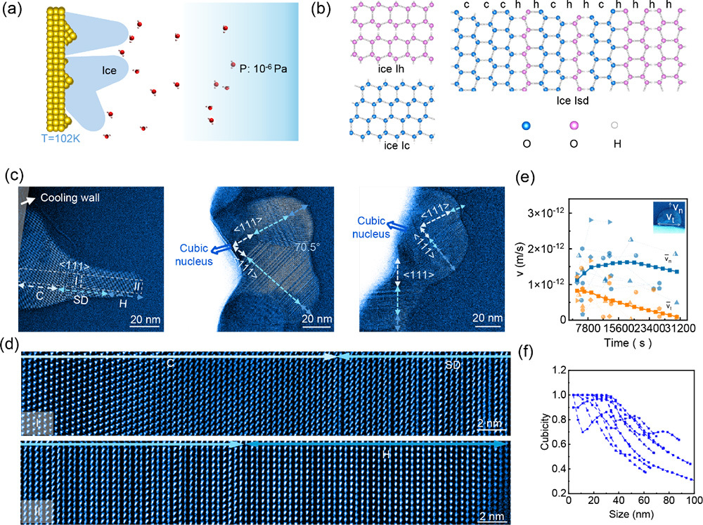 中国科学院物理研究所/北京凝聚态物理国家研究中心表面物理实验室白雪冬课题组二十余年来持续推动原位透射电子显微技术的发展,近期,利用自主研发的原子分辨原位冷冻电镜技术,在约 102 K、高真空条件下,通过水蒸气在金属冷壁表面沉积成冰,首次直接追踪了冰晶从成核到生长的相选择与演化完整过程。
